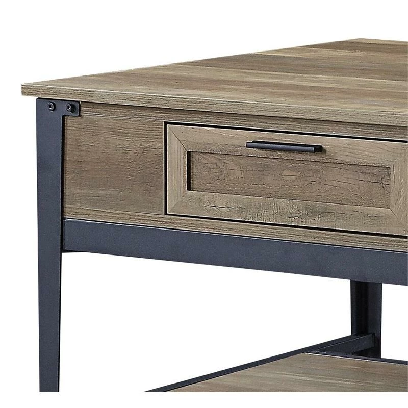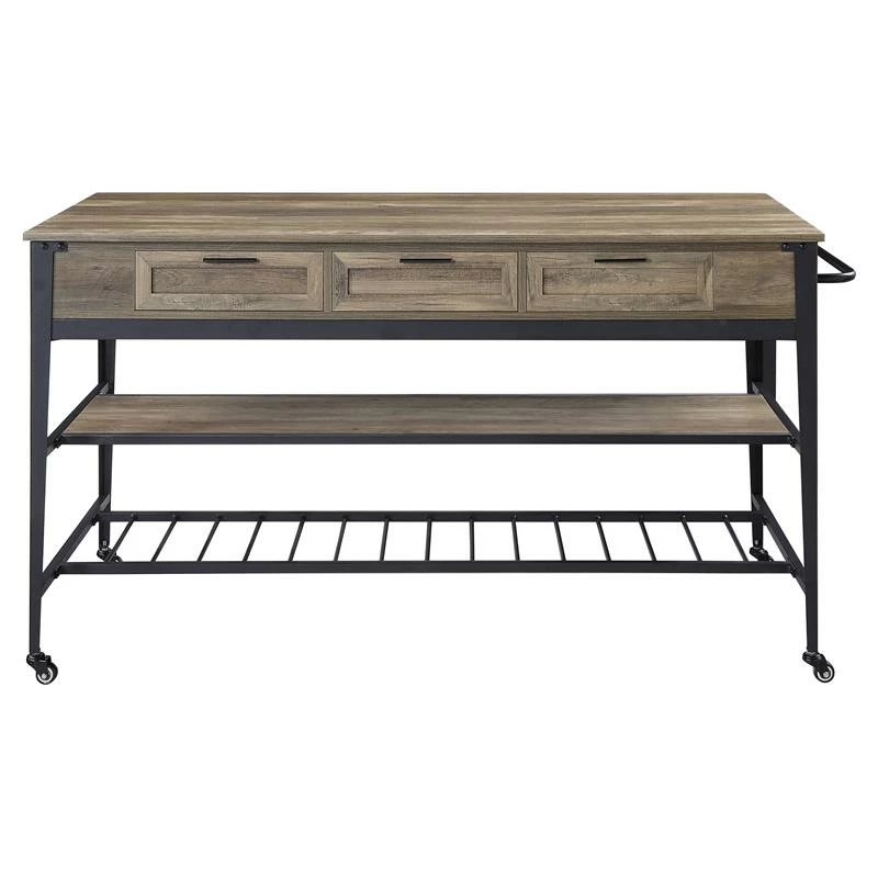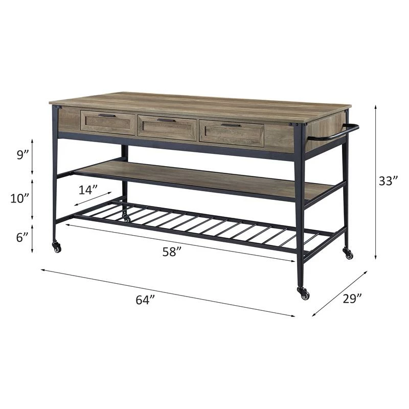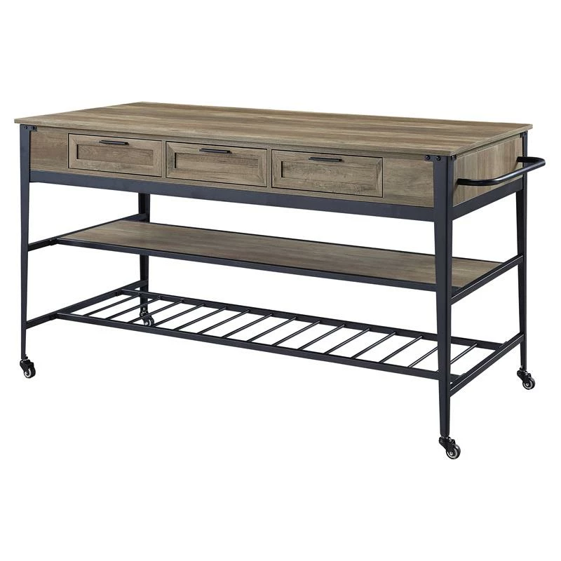 Add extra countertop space without sacrificing style with this industrial functional design. Rustic oak wooden top and sleek metal frame complement each other perfectly, creating this bold, stand-out piece. This rectangular kitchen island offers three drawers and two-tier shelf to keep essential kitchen tools within your arm’s reach. Four wheels on the bottom of the island include wheel stops, providing easy and stable mobility throughout your space.