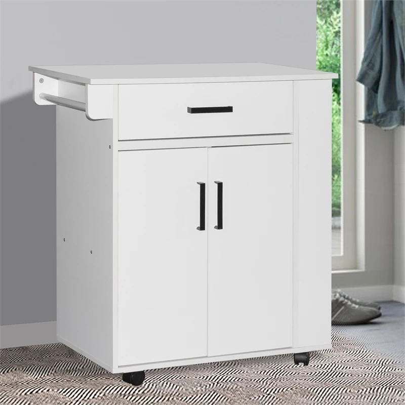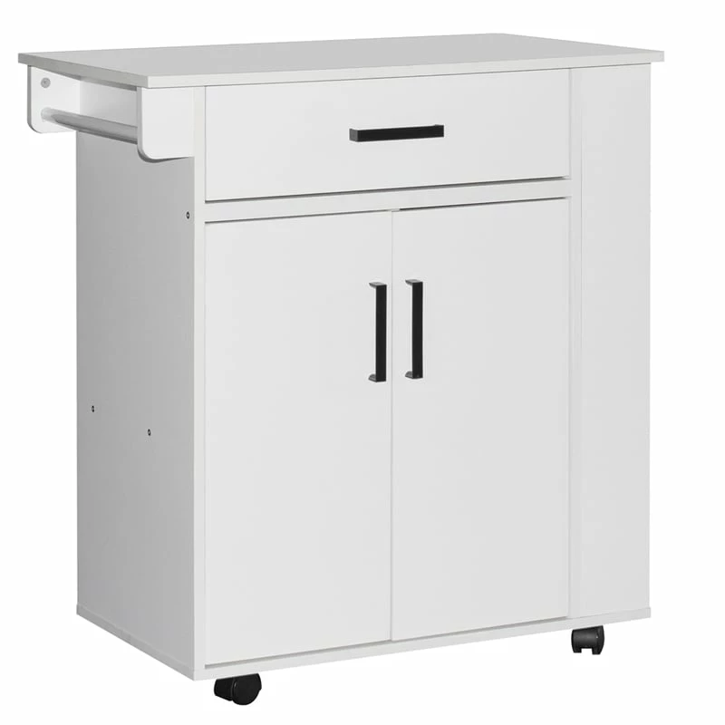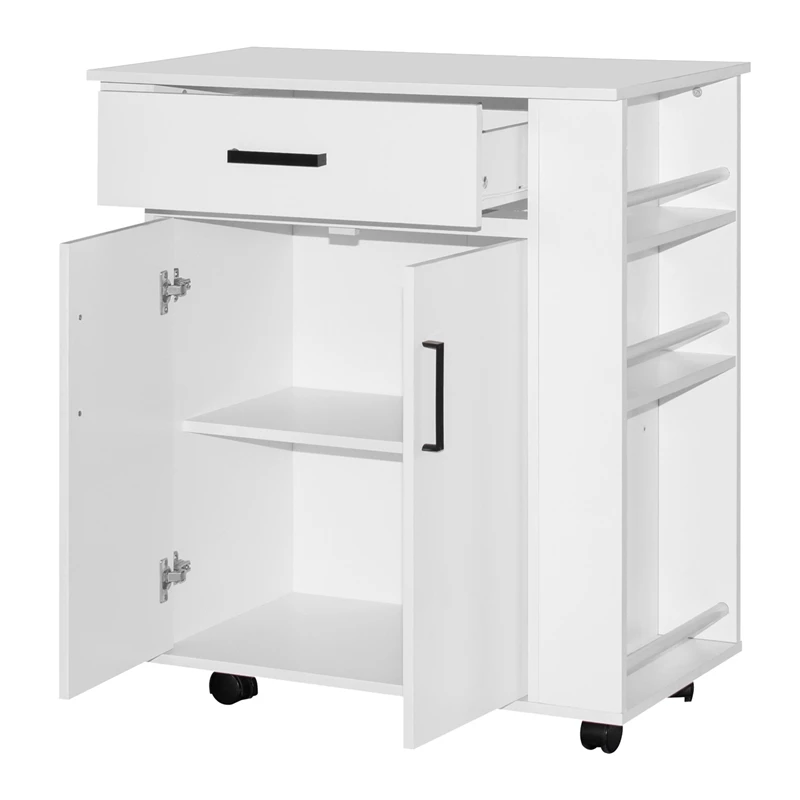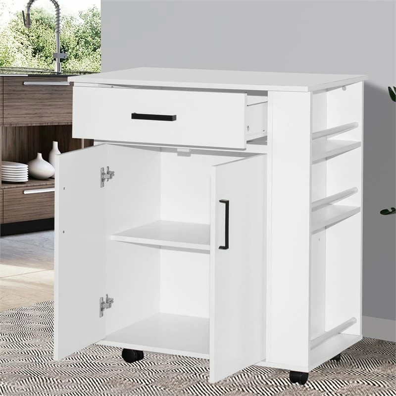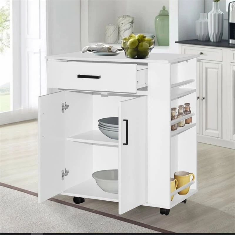 The Better Home Products Shelby Rolling Kitchen Cart with Storage Cabinet brings style and functionality to your kitchen space – as it provides you with a handy food preparation surface and storage cart all in one. Casters ensures high mobility and the pull-out drawer running smoothly on metal slides, plus two shelve cabinet behind the two doors, and towel holder provide it with ample storage. Three level open spice rack helps organize spices for easy access when preparing meals. Crafted from premium laminated engineered wood in Mahogany, Tobacco, White and Gray color finish, this kitchen island can fit various home decoration styles. Assembly required.