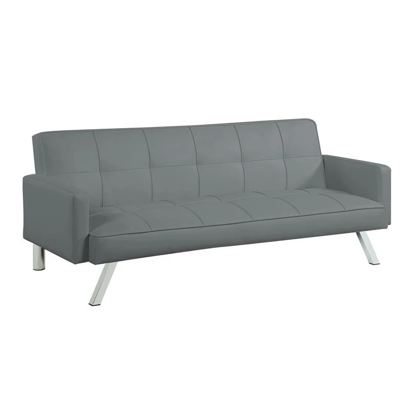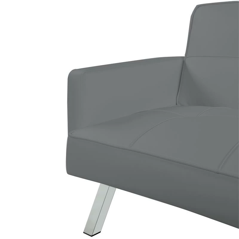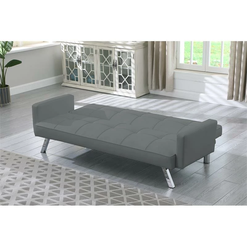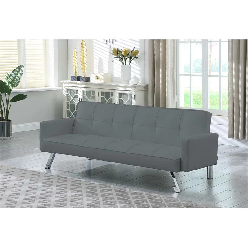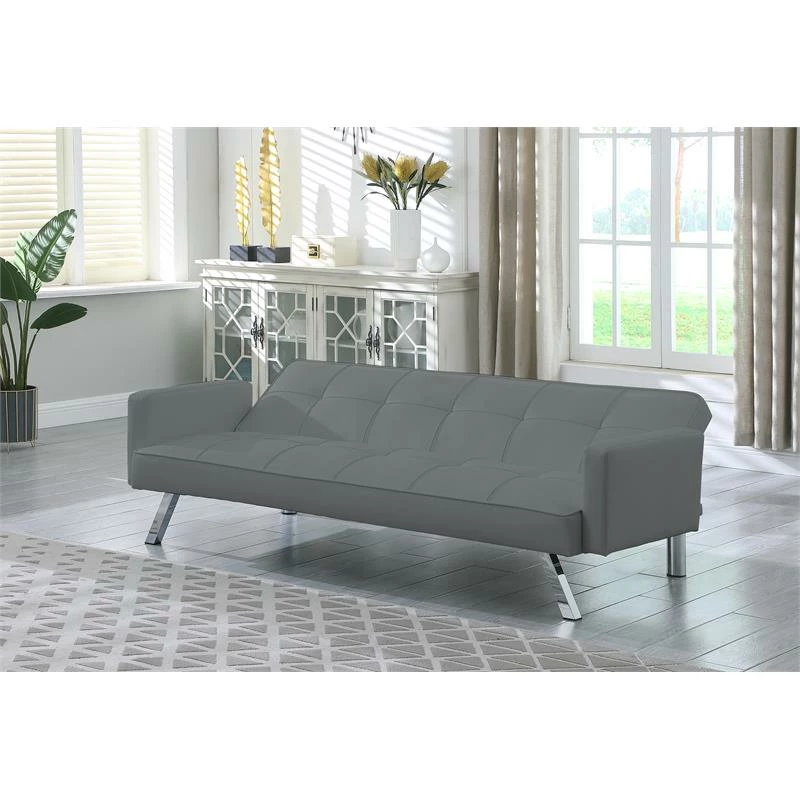 Our Nario Convertible Sleeper Sofa sets the tone for a modern space. Founded atop sleek chrome legs, it features a streamlined silhouette wrapped in faux leather accented by biscuit-tufted details. Foam fill in the cushions give you and your guests an inviting place to relax. Built strong, this multi-function sofa transforms into an optional lounger and sleeper making it perfect for the den or guest room. Assembly required.