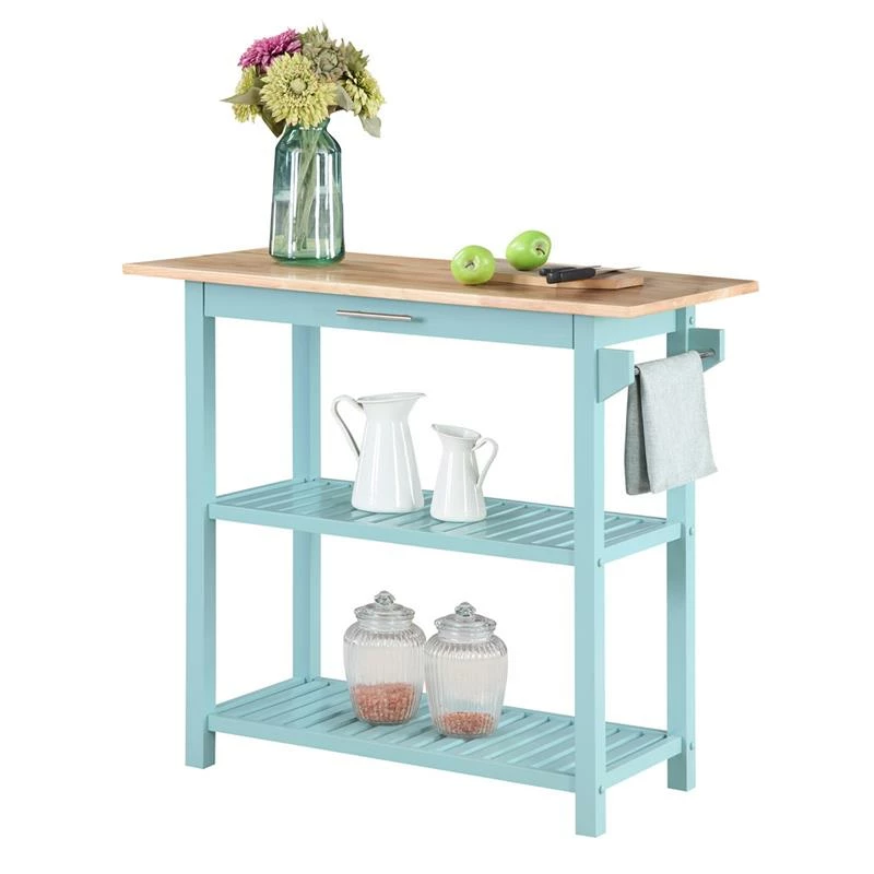 The Designs2Go Three-Tier Butcher Block Kitchen Prep Island with Drawer by Convenience Concepts combines style and smarts all in one. Expand your countertop space and make dinner preparation even easier by displaying this stationary island in the center of your kitchen. The smooth butcher block countertop is ideal for efficient food prep and the stainless steel towel rack allows for easy cleaning. Two additional shelves and one spacious drawer on smooth roller slides offer easy access to kitchen essentials. This finely-crafted piece of solid rubberwood, MDF, and non-lead-based paint is perfect for small kitchens, apartments, and anywhere you might need a little extra storage or kitchen prep space. Coordinating with existing interiors could not be easier thanks to the assortment of finishes available. Add this eye-catching Designs2Go Three-Tier Butcher Block Kitchen Prep Island with Drawer from Convenience Concepts to keep your space effortlessly organized.