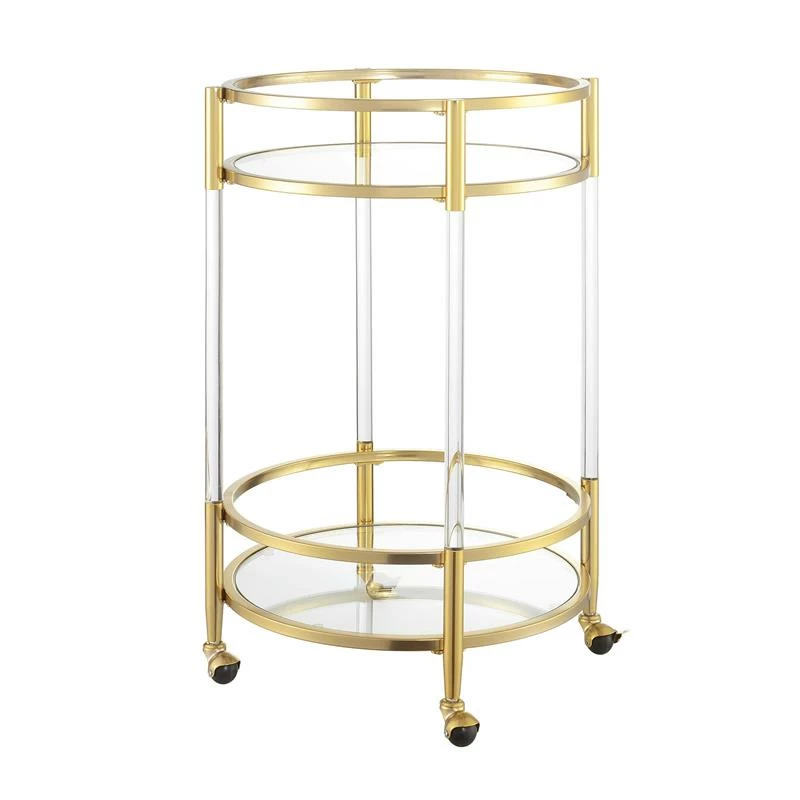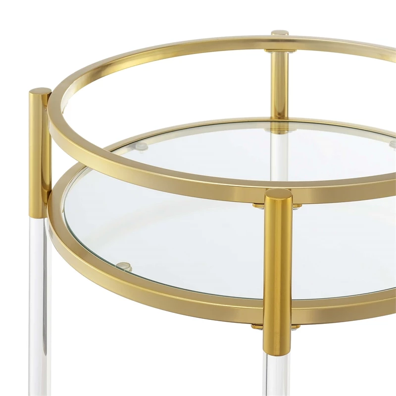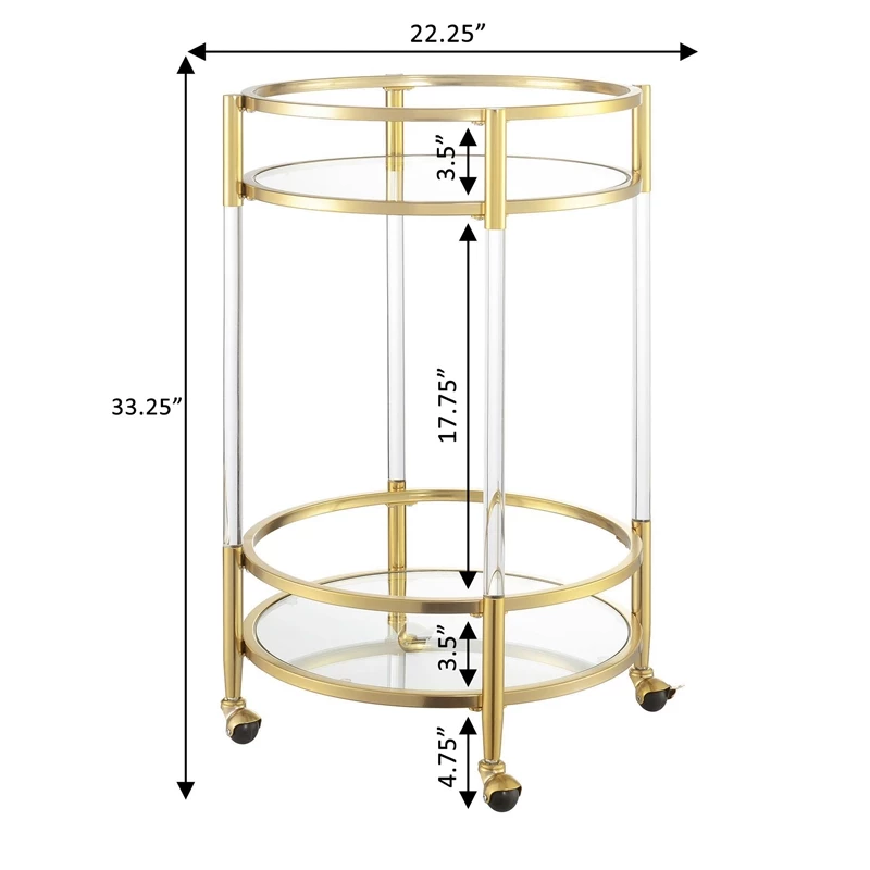 Entertain your guests with the luxurious Royal Crest Two-Tier Acrylic Round Bar Cart by Convenience Concepts. Two gold chrome frames with two tiers of clear tempered glass shelves are connected by four sturdy acrylic legs. Great for entertaining, this contemporary bar cart offers plenty of space to pour and store favorite beverages. Four locking swivel caster wheels allow for easy mobility and two tempered glass shelves allow for easy cleanup. Glam up your living space with additional pieces from the Royal Crest Collection by Convenience Concepts, each sold separately.