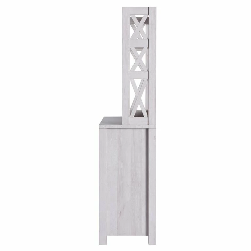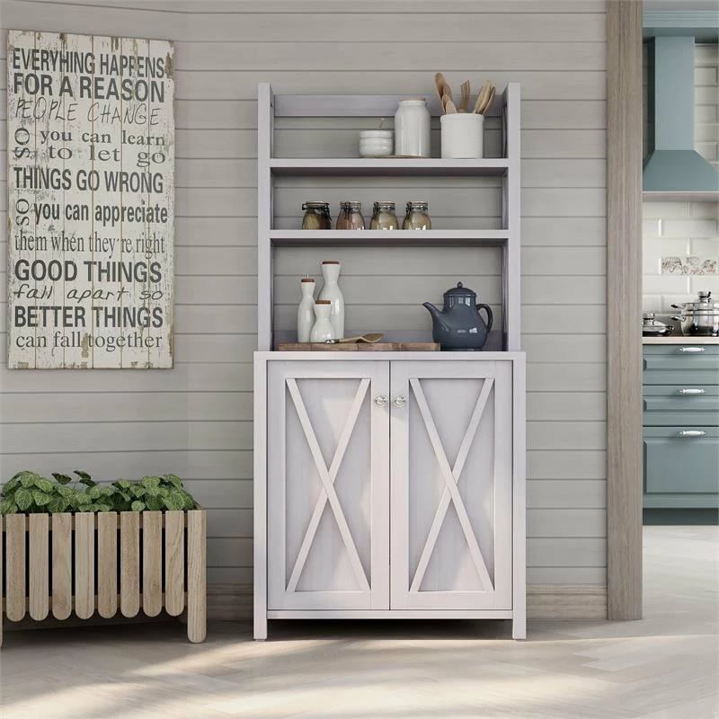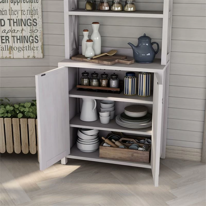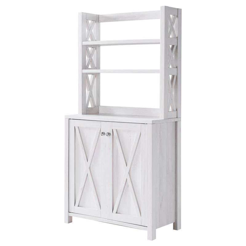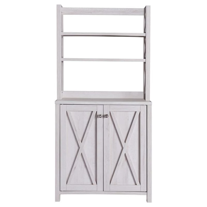 Elevate an open kitchen floor plan with this all-inclusive wood baker rack design that will keep clutter at bay. The white oak finish baker rack features open and enclosed shelving for you to choose what to display. The faux marble surface is beautifully accented by the crisscross side beams, emulating the treasured barn door designs that emulate the farmhouse style to a tee.
