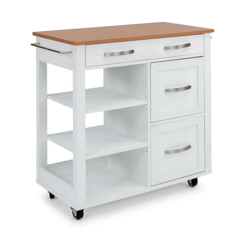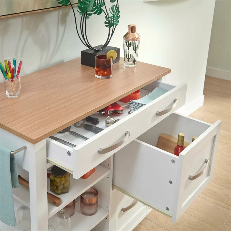 A well organized kitchen is everyone’s dream, and this Homestyles Storage Plus Kitchen Cart makes it come true. Adjustable open shelves and drawers of various sizes allow for true customization. The durable laminate surface is built to stand the heat of any kitchen.