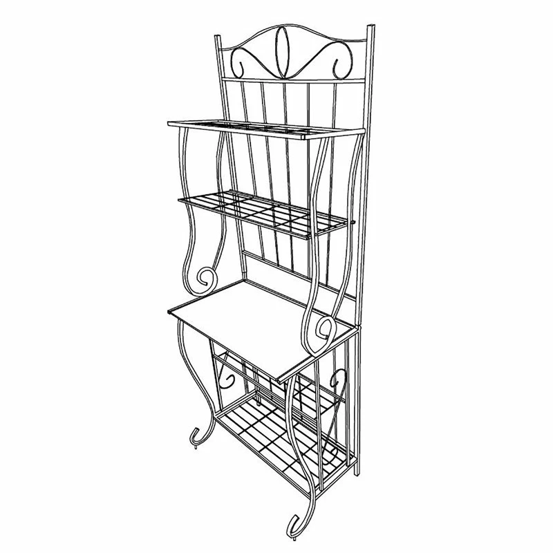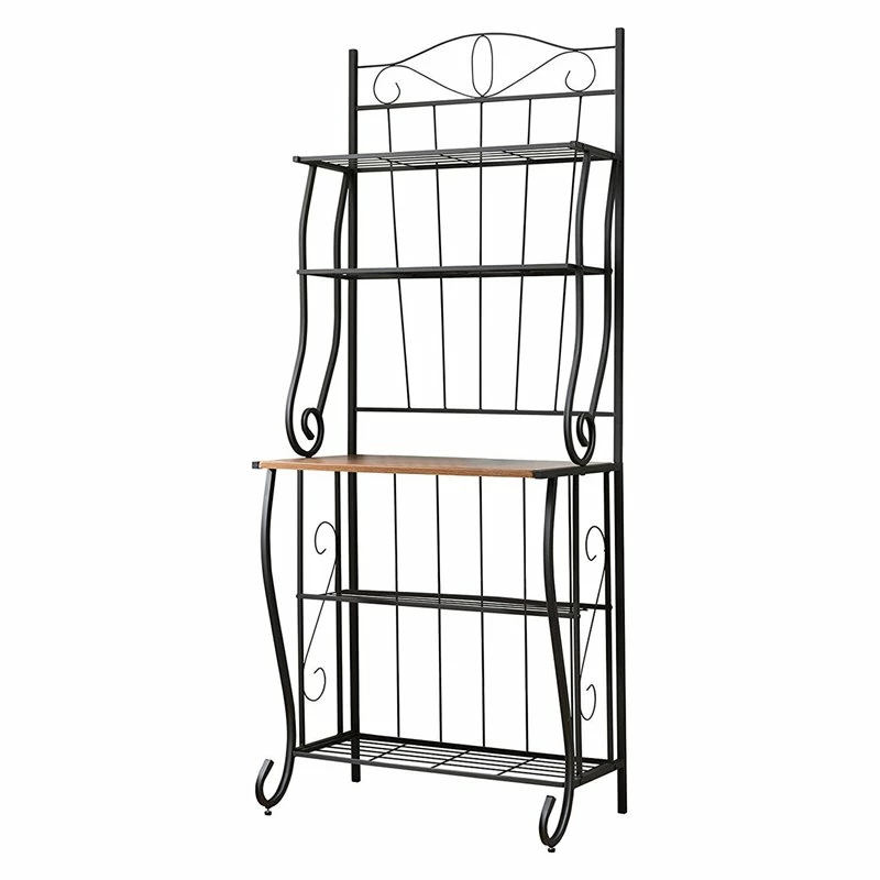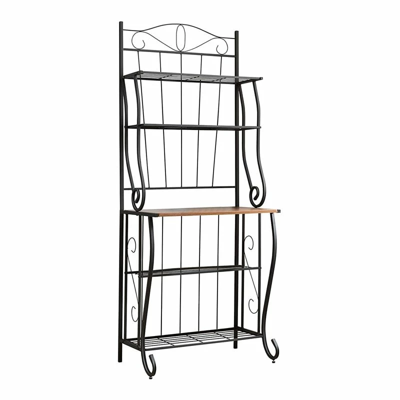 Amelia 5 Tier Free Standing Kitchen Storage Bakers Rack, Black Metal Frame & Walnut Wood Center Shelf, Transitional. With its slatted back and spiral design, this Amelia Bakers Rack is a simplified take on a classic design. Defined by a black finish, this handsome piece features five spacious shelves supported by a durable metal frame. An excellent storage option for your open concept eat-in kitchen, the shelves are perfect for displaying your favorite cookbooks, extra barware, and your heirloom tea set.