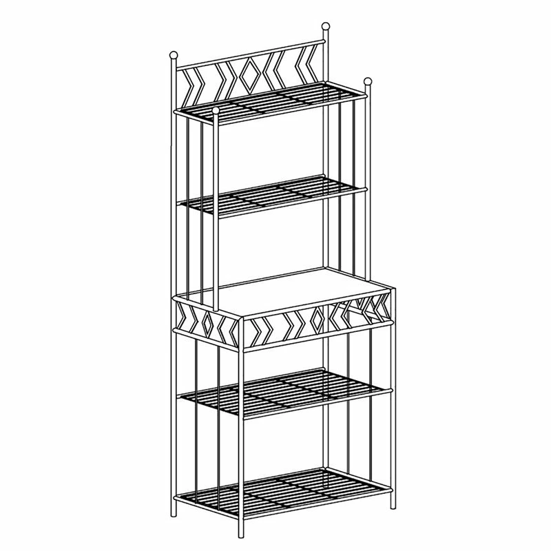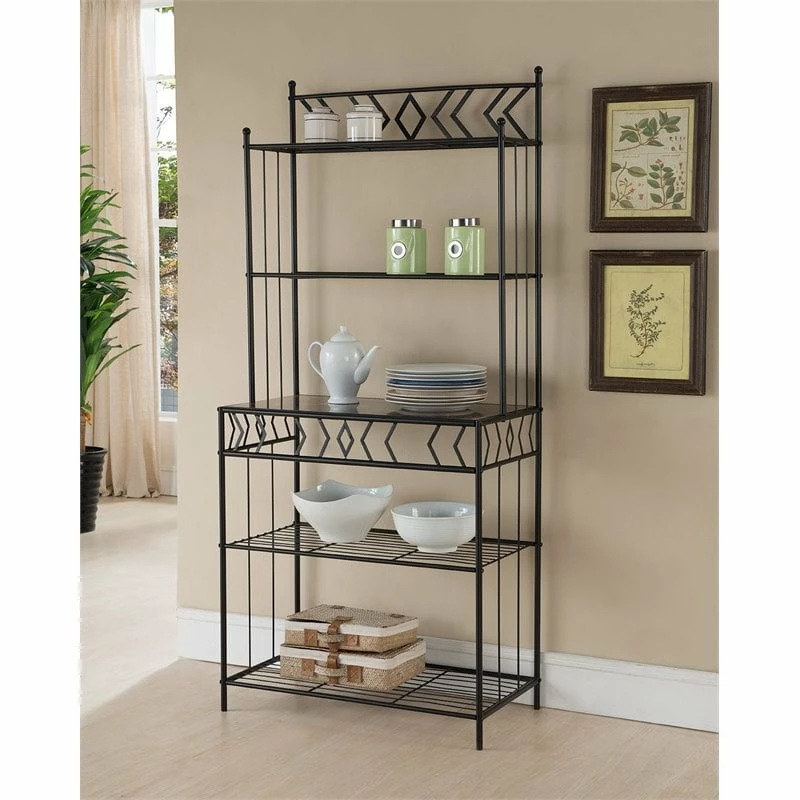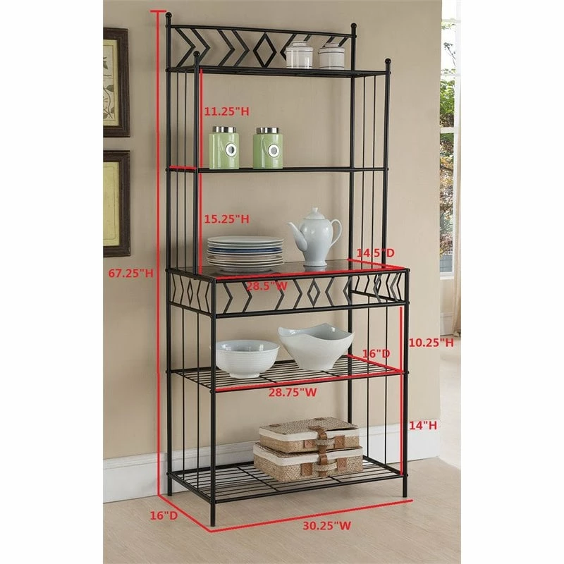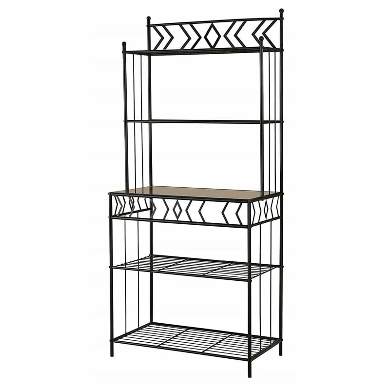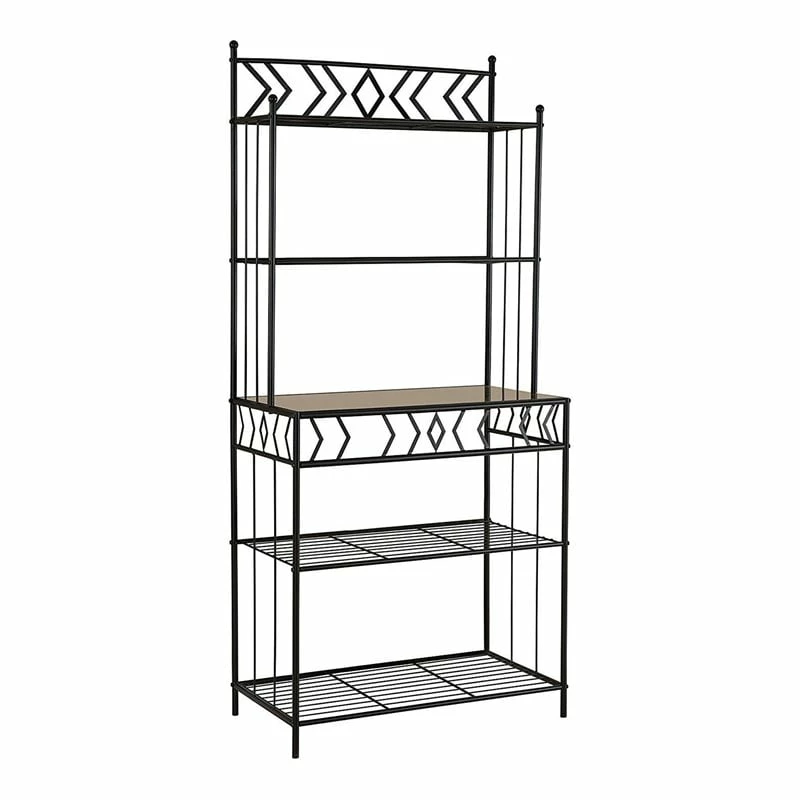 Alice 5 Tier Free Standing Kitchen Storage Bakers Rack, Black Metal & Wood, Transitional. With its slatted sides, this Alice 5 Tier Free Standing Bakers Rack is a simplified take on a classic design. Defined by a black finish, this handsome piece features five spacious storage shelves supported by a durable metal frame. An excellent storage option for your open concept eat-in kitchen, the shelves are perfect for displaying your favorite cookbooks, extra barware, and your heirloom tea set. For a timeless twist, try this design as an elegant bookcase alternative in your living room.