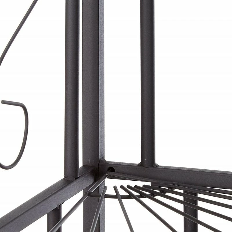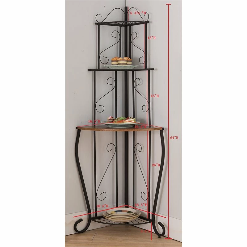Daisy Black Metal & Walnut Wood Transitional Freestanding 4 Tier Shelves Corner Storage Kitchen Bakers Organizer Display Rack Stand. With its designed back and scrollwork crown, this freestanding corner baker’s rack is a simplified take on a classic design. Defined by a black finish, this handsome piece features four spacious shelves supported by a durable metal frame. An excellent storage option for your open concept eat-in kitchen, the shelves are perfect for displaying your favorite cookbooks, extra barware, and your heirloom tea set.