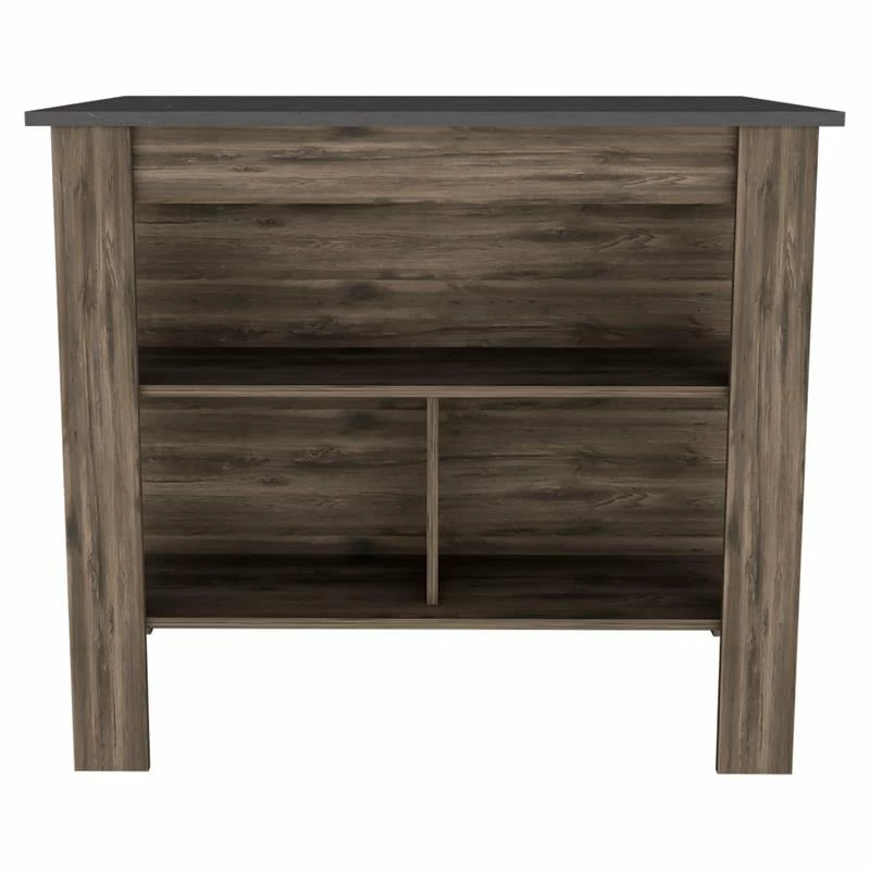The TuHome Cala Kitchen Island brings style and functionality to your kitchen space. The large tabletop provides an open work area / display shelf. Below the tabletop, you will find one side with two shelves for additional storage space (12 In Height x 12 in Deep x 38 in Lenght). The bottom shelf is split into two equal sections, all of them are perfect for displaying any decor, pots, pans or having kitchen utensils handy when you need them; The other side is designed to be a working station where you can sit with leg room to confortably prep your meals. This two-tone finished piece is sure to draw the attention of your guests. Product Dimensions: 35.4 H x 40.5 W x 27.5 D