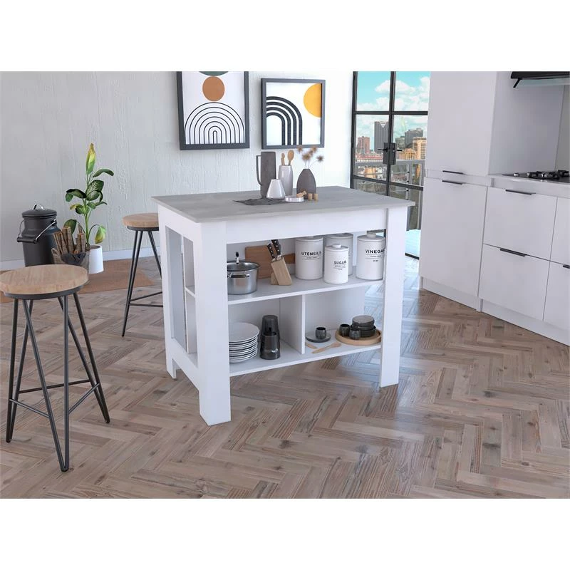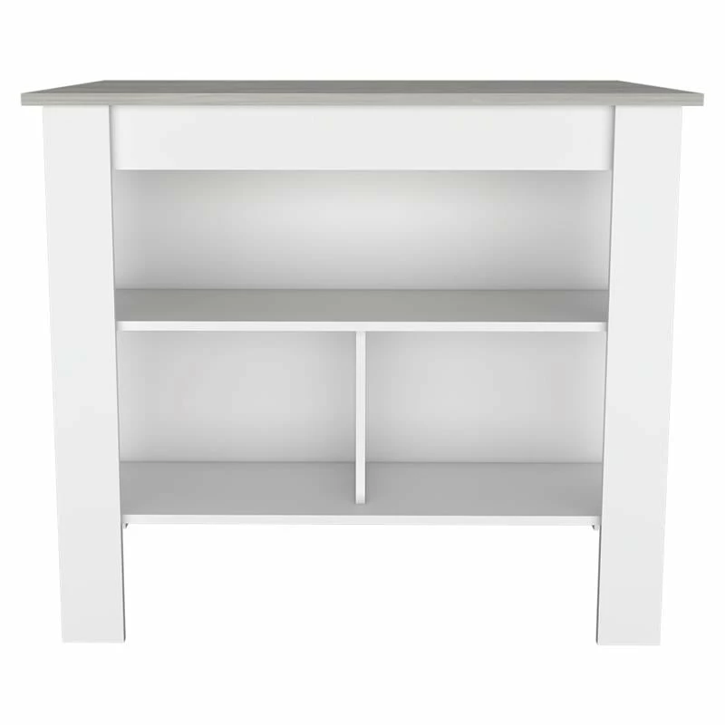The TuHome Cala Kitchen Island brings style and functionality to your kitchen space. The large tabletop provides an open work area / display shelf. Below the tabletop, you will find one side with two shelves for additional storage space (12 In Height x 12 in Deep x 38 in Lenght). The bottom shelf is split into two equal sections, all of them are perfect for displaying any decor, pots, pans or having kitchen utensils handy when you need them; The other side is designed to be a working station where you can sit with leg room to confortably prep your meals. This two-tone finished piece is sure to draw the attention of your guests. Product Dimensions: 35.4 H x 40.5 W x 27.5 D